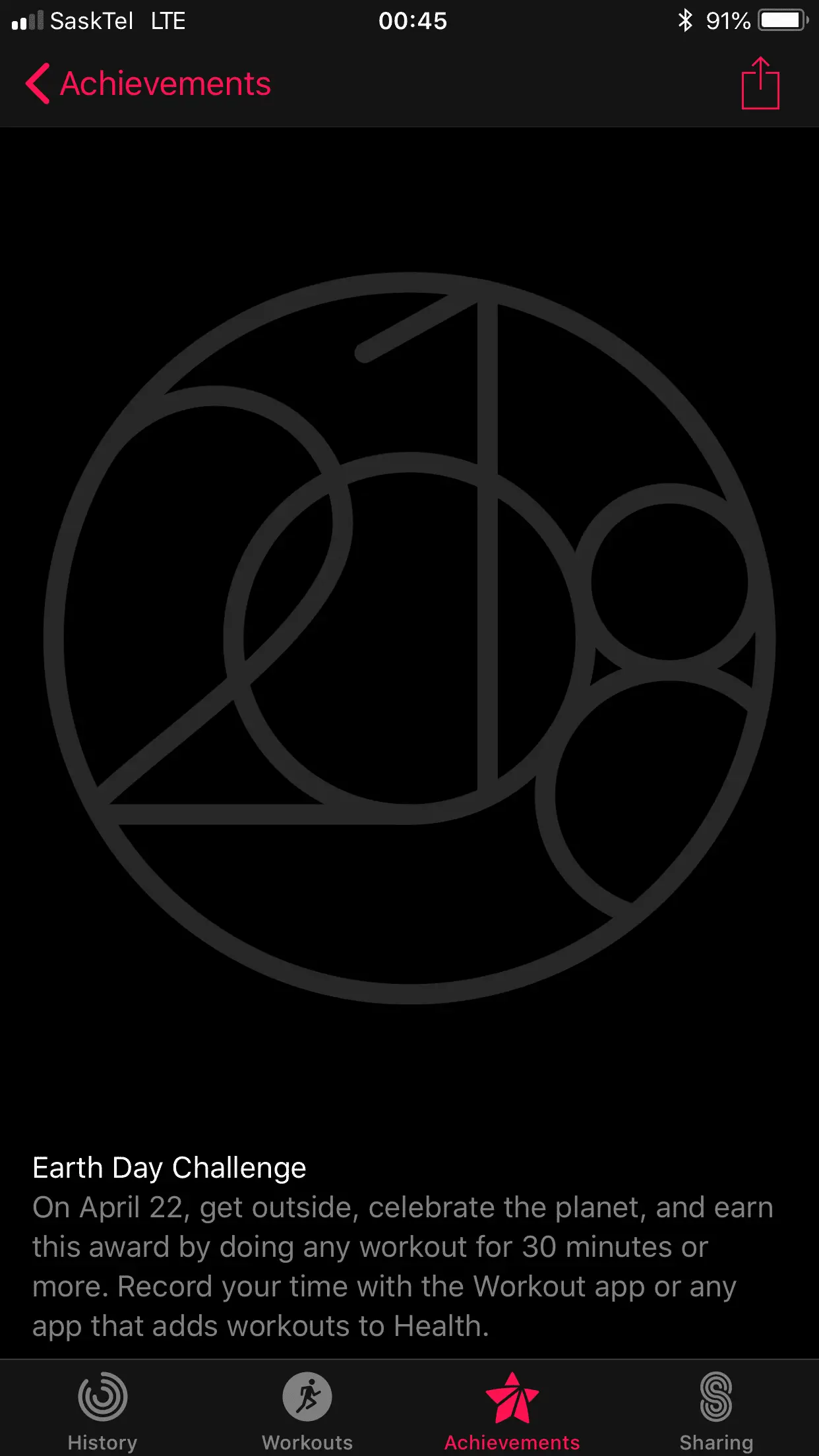 It‘s a global challenge, but it didn‘t appear in my Activity app. As my watch is acting up recently (still no January Challenge showing, losing connection to the iPhone at least once a day), I guess it‘s a problem with my hardware or software.April 22nd is Earth Day and for the second year Apple has issued the Earth Day Challenge. A 30 minute workout will get you this award.