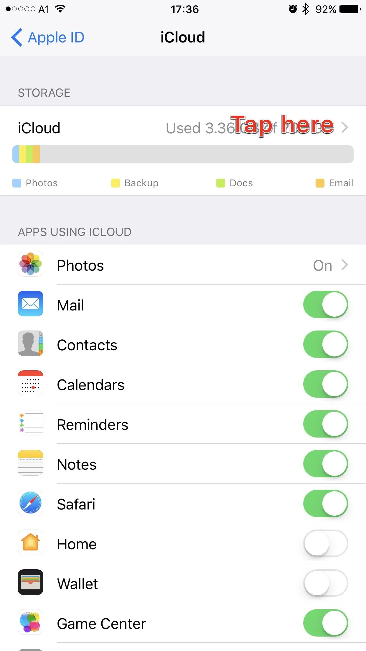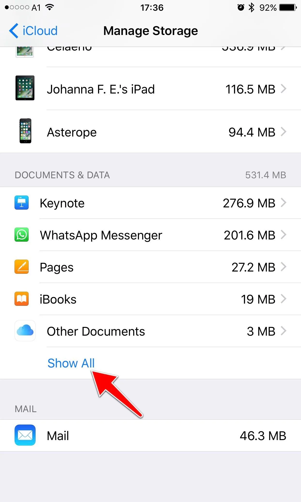 The problem is when we go to Apple ID then to Storage, our photos (blue), backups (yellow) and email (orange) all look about the same. However, my 'Docs' section is a small sliver of green but hers is taking up most of the room left over after the other three. Visually it is as large as her other 3 combined. How do we see, edit and erase that?? I'm going nuts here!