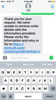 See my results screenshot. Another way is to click on a link in their email, that just gets me to a website with another error message. Also my order number on the ATT email refuses to copy and paste so I have to write it on paper and type it in every time I try to search.