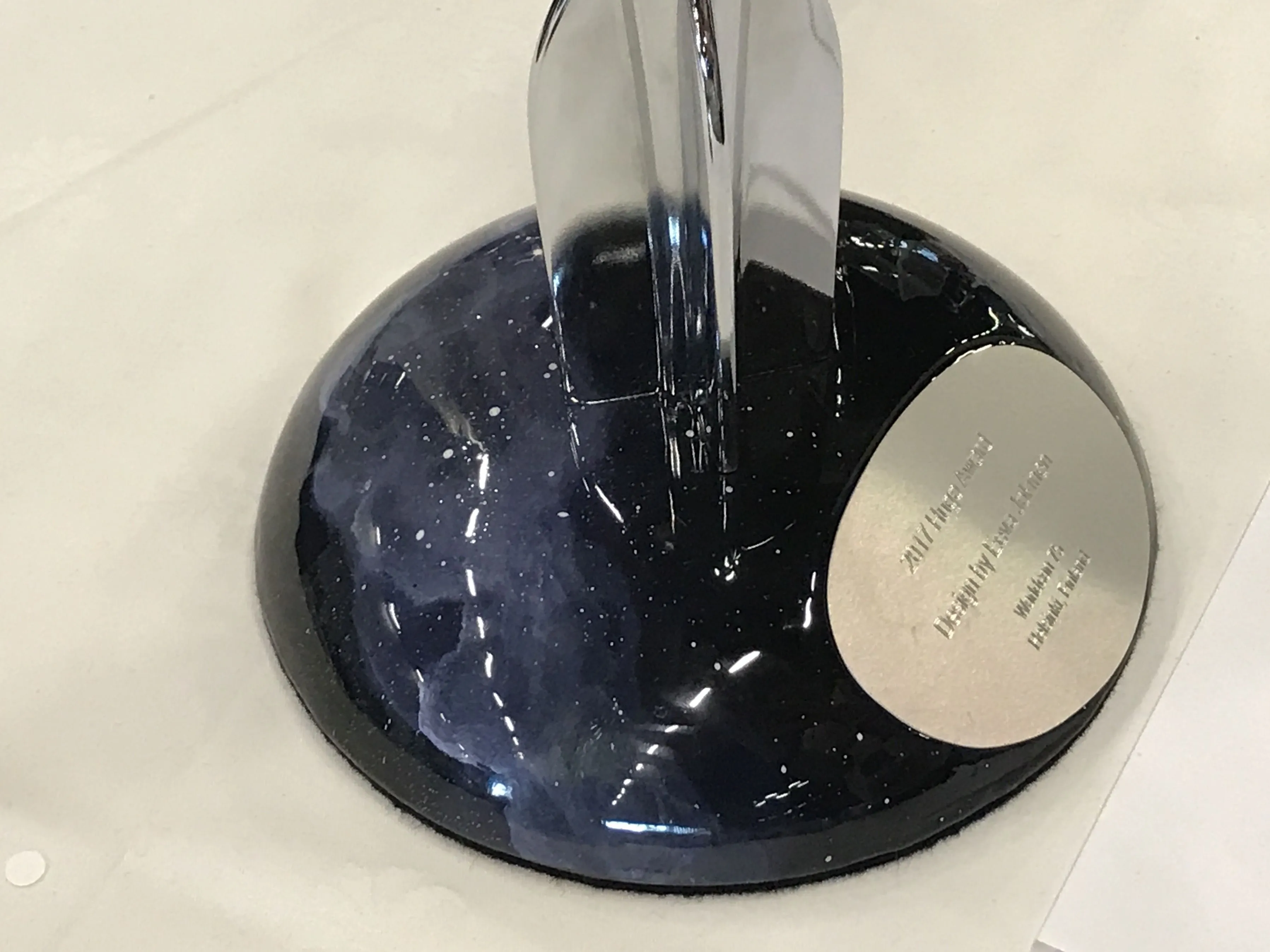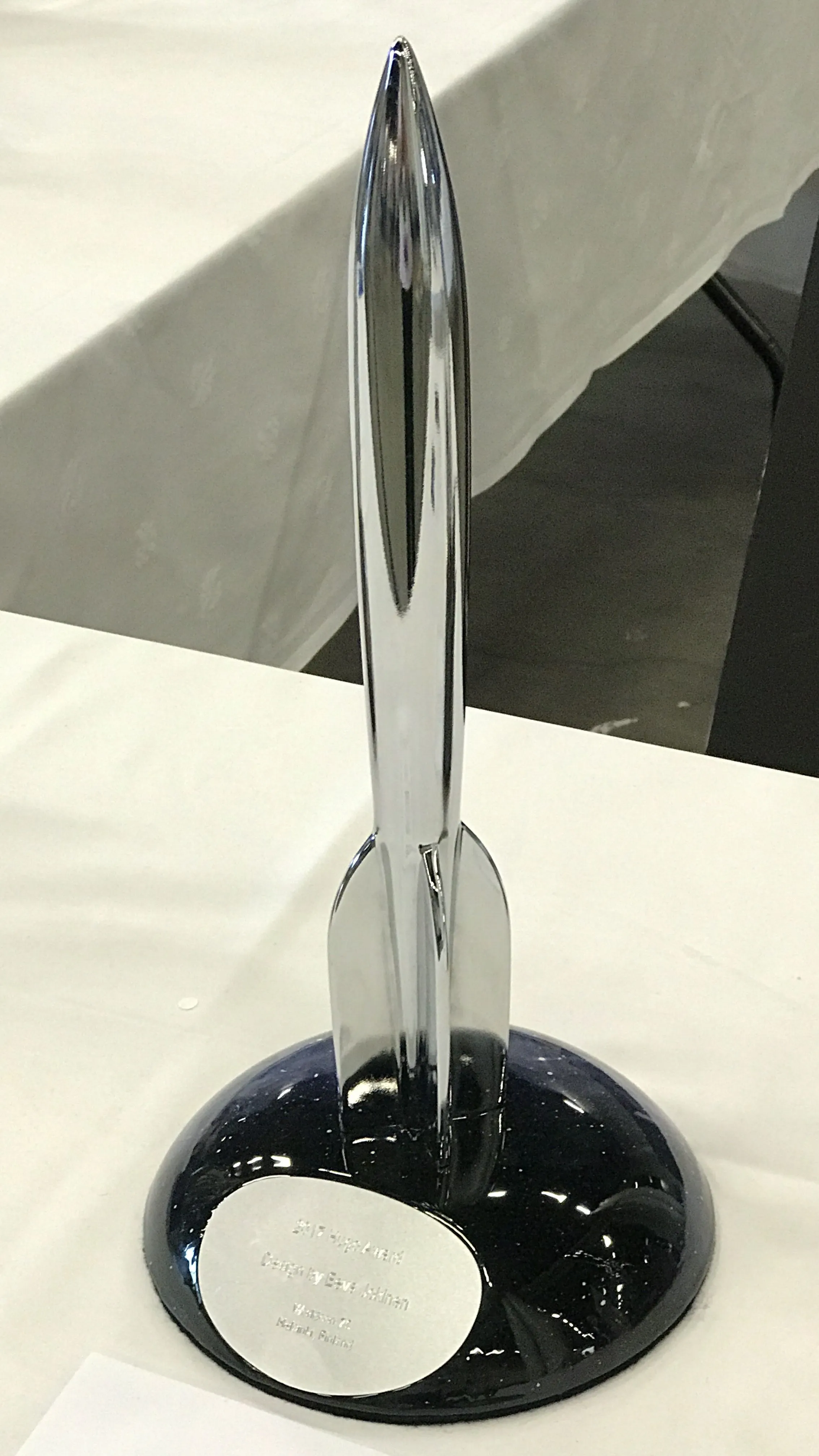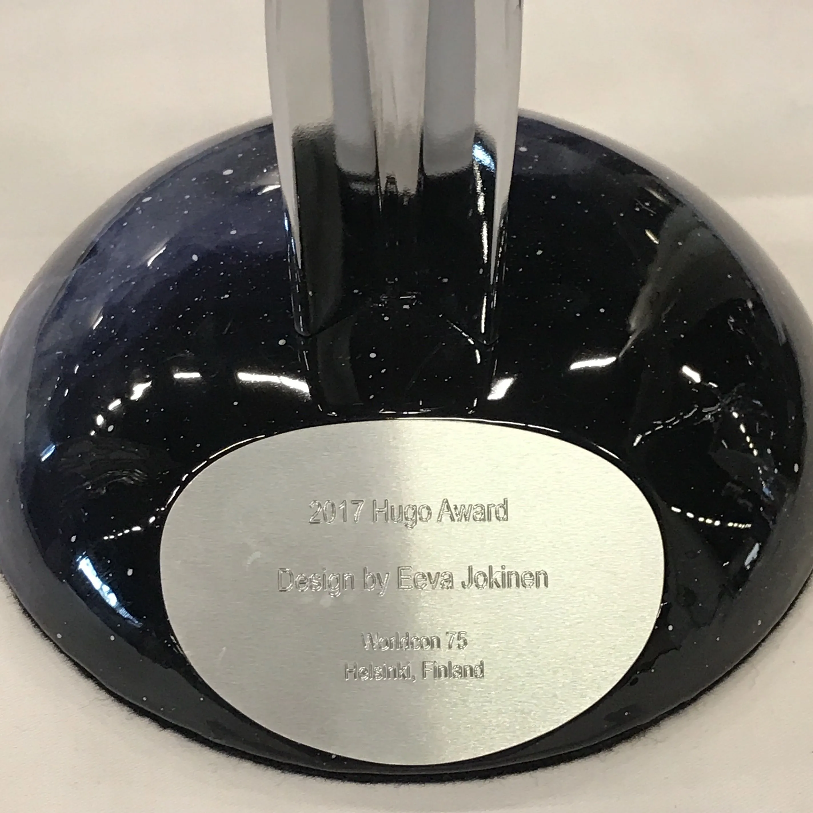 The base looks like some kind of ceramic. It's nice and simple and doesn't overwhelm the Hugo rocket.This year's Hugo Award