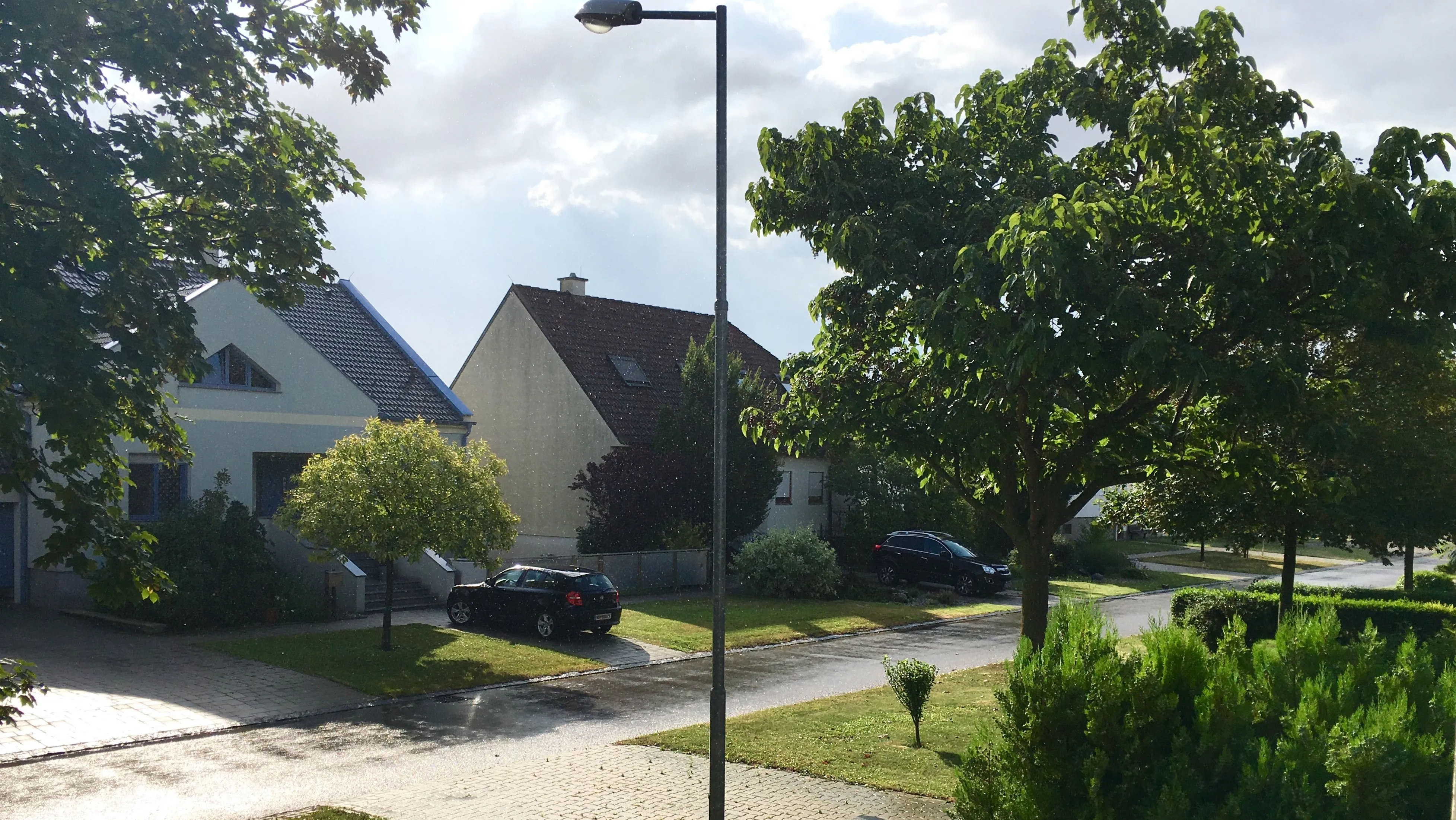 It almost looks like it's snowing, the way the light's reflecting off the raindrops.Rain + sunshine = glistening raindrops