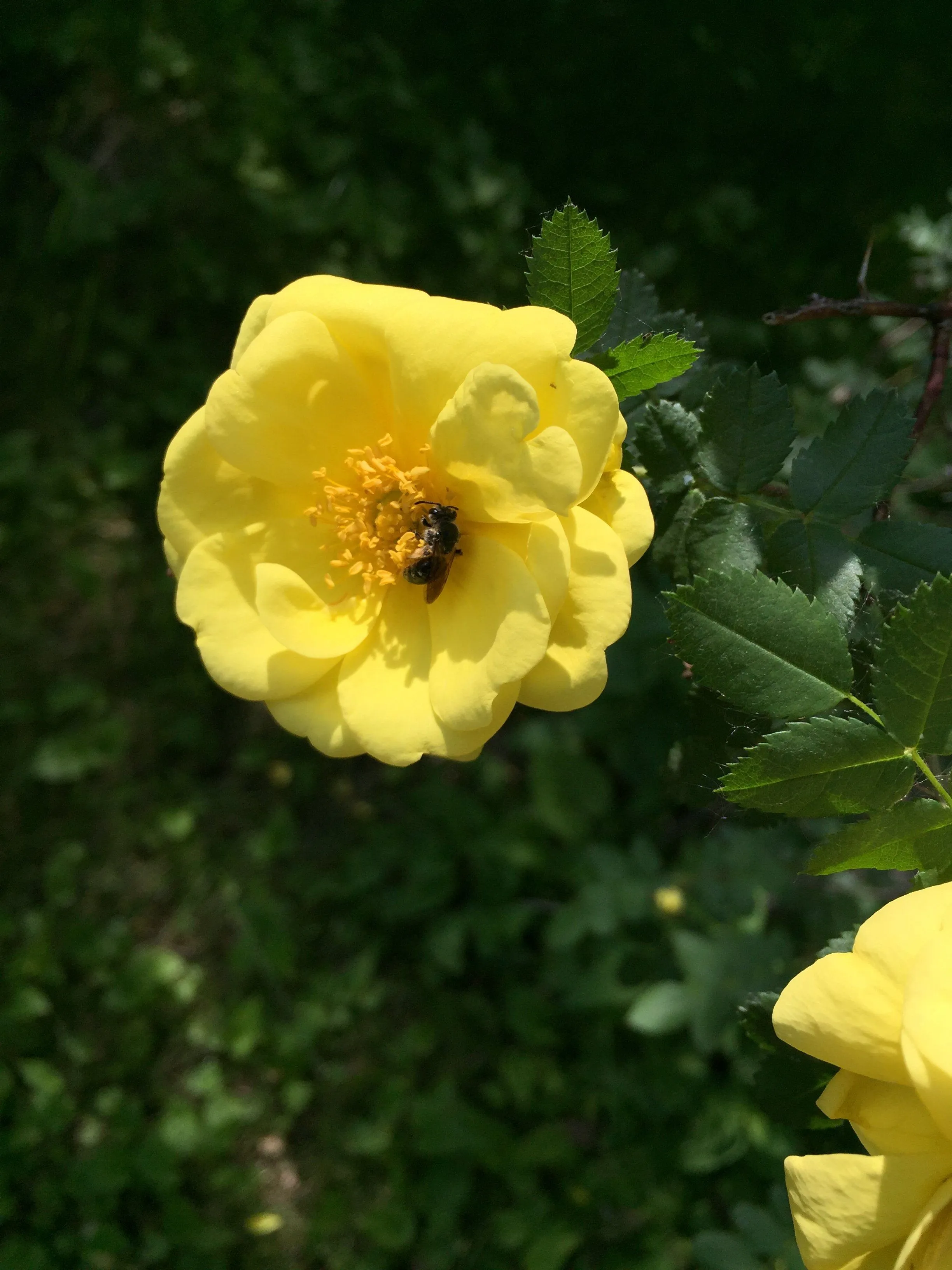 Great photos!Some roses I saw during my morning walk. The second photo shows a wasp pollinating the rose.
