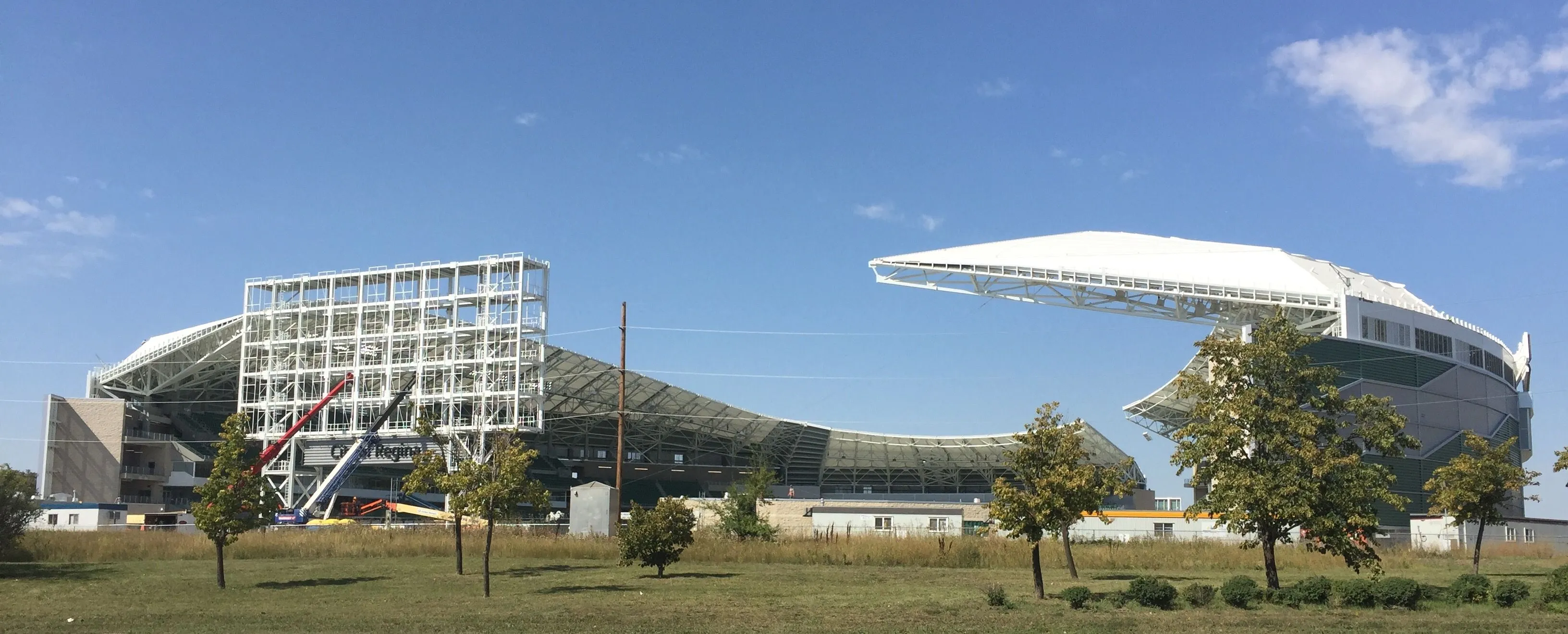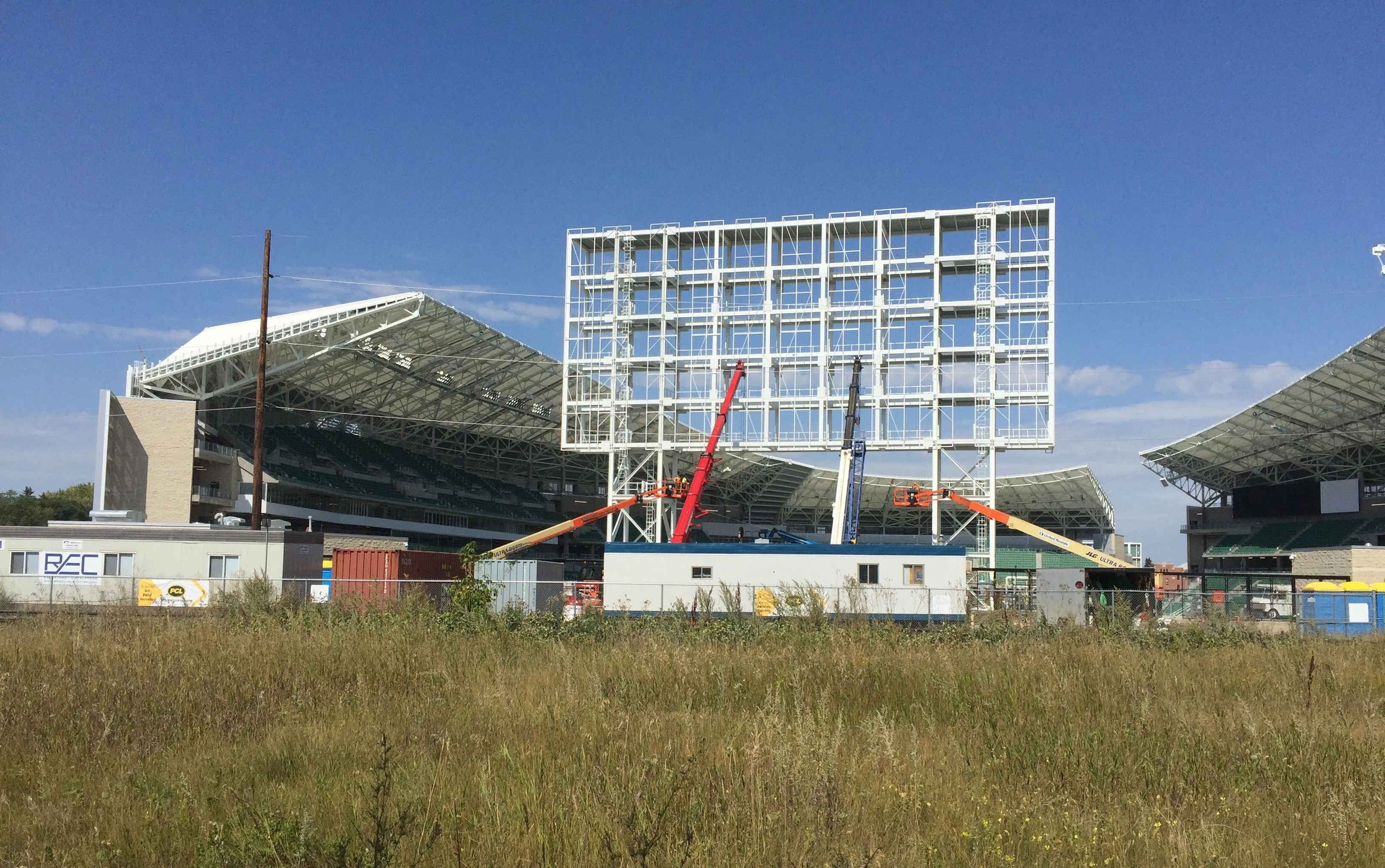 That's the first time I've noticed how huge the scoreboard is, with people as "benchmark".The new football stadium, with a crew working on the scoreboard.