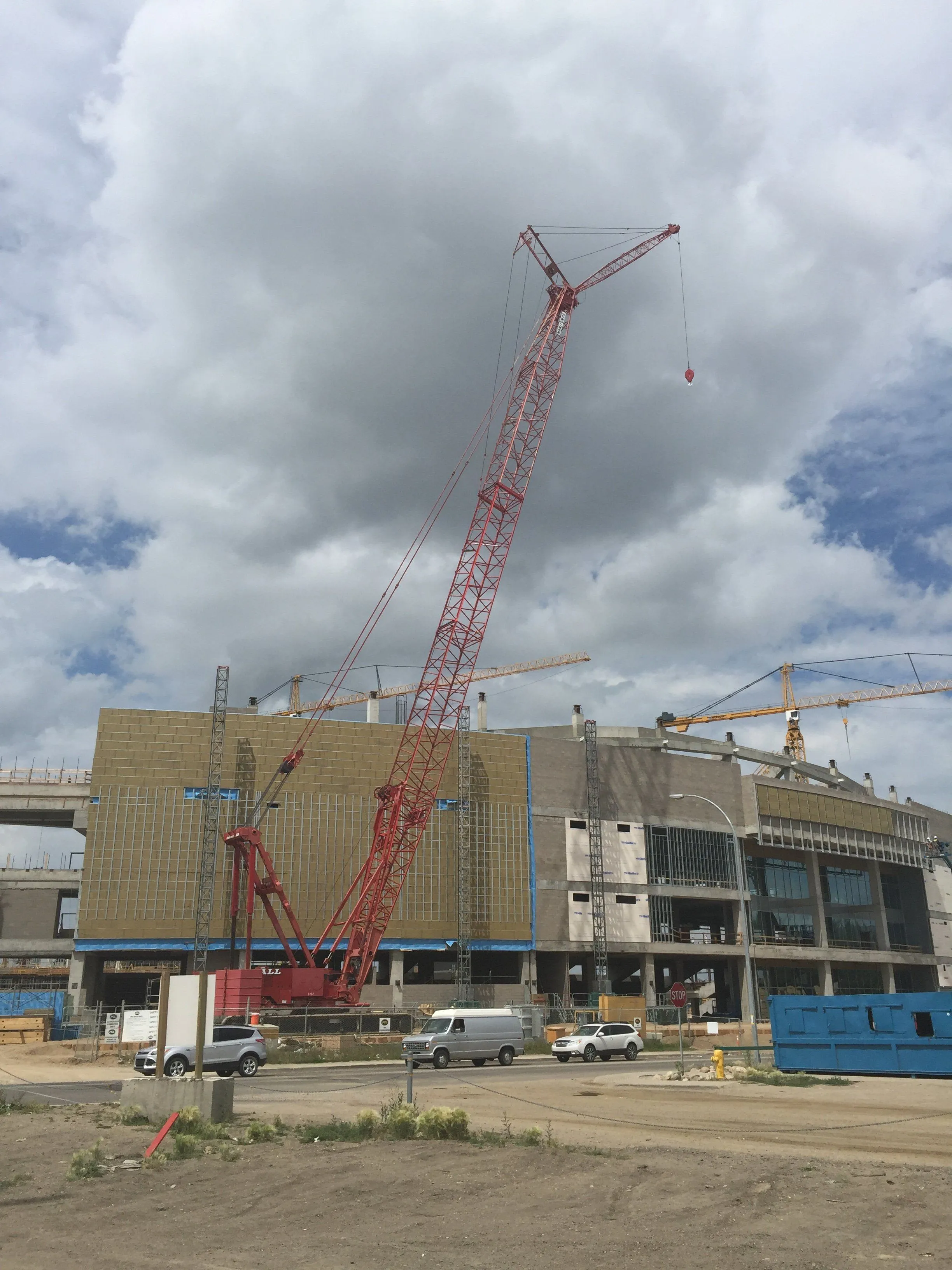 It looks like one of these which help building wind turbines in my district.Large crawler crane at the stadium construction site in Regina. It will lift the roof sections into place.