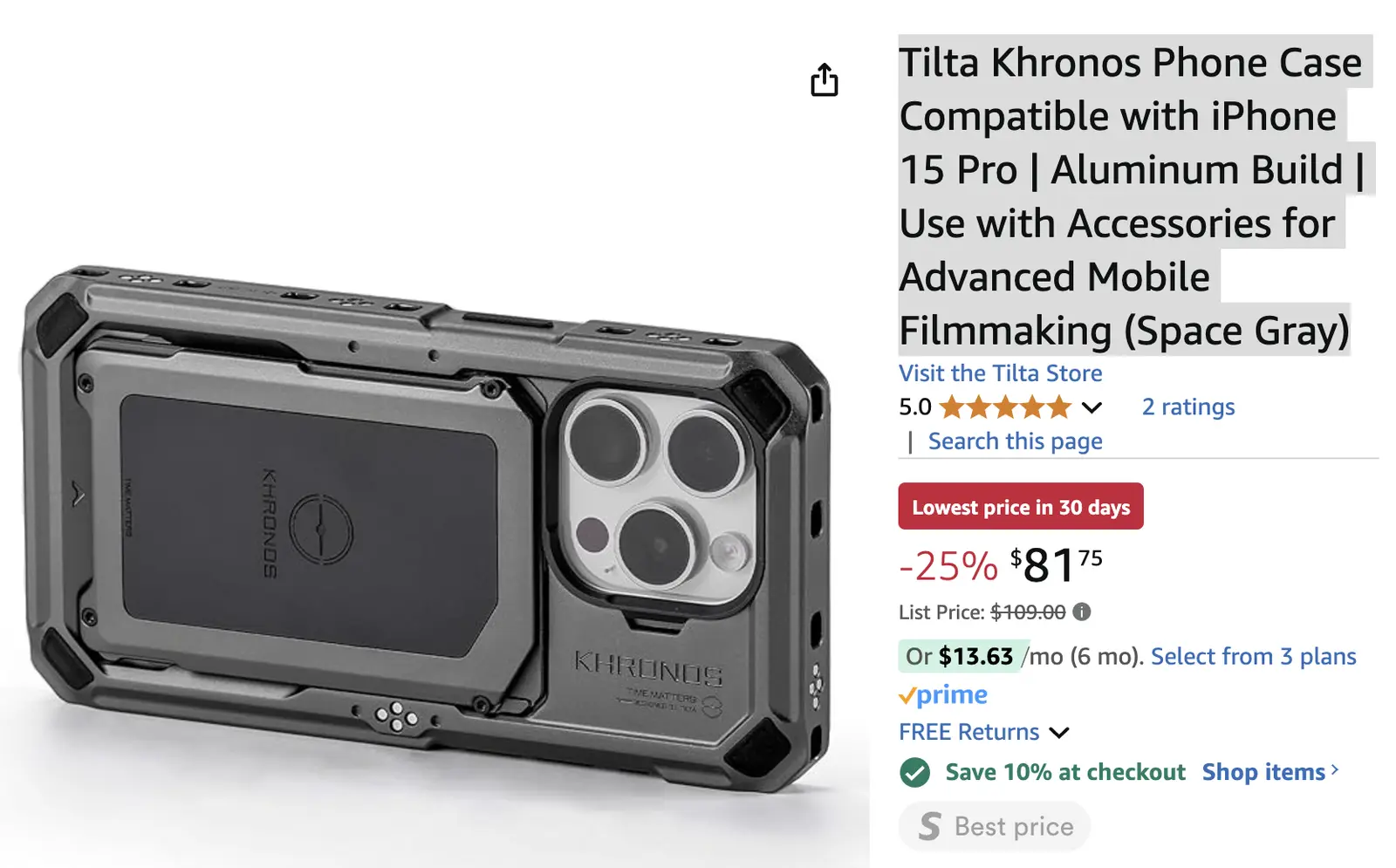 $81 - Tilta Khronos Phone Case Compatible with iPhone 15 Pro | Aluminum Build | Use with Accessories for Advanced Mobile Filmmaking (Space Gray)