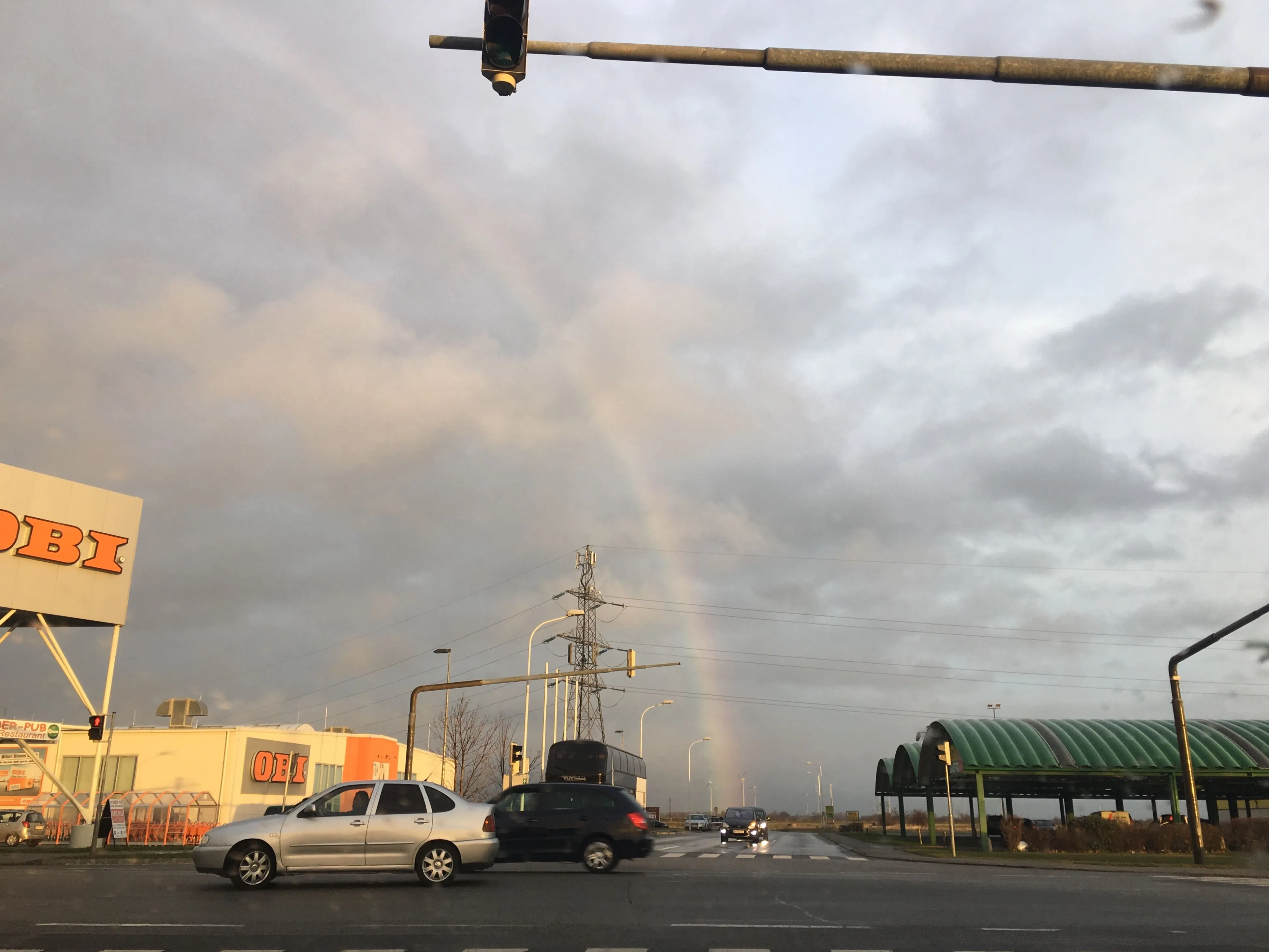 Stormy and raining notwithstanding, your rainbow photos are still quite nice.When I had to stop because of the red light, I saw a rainbow: