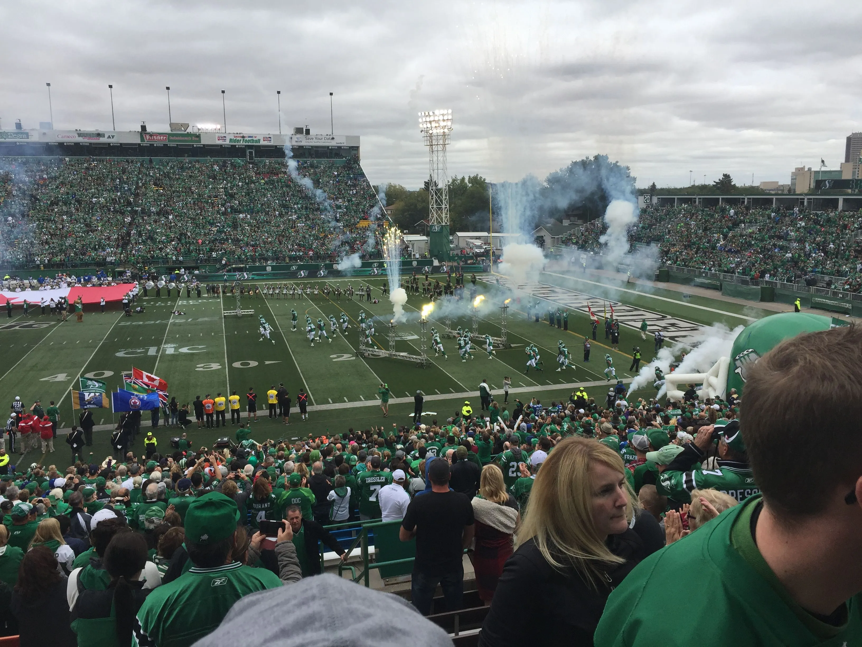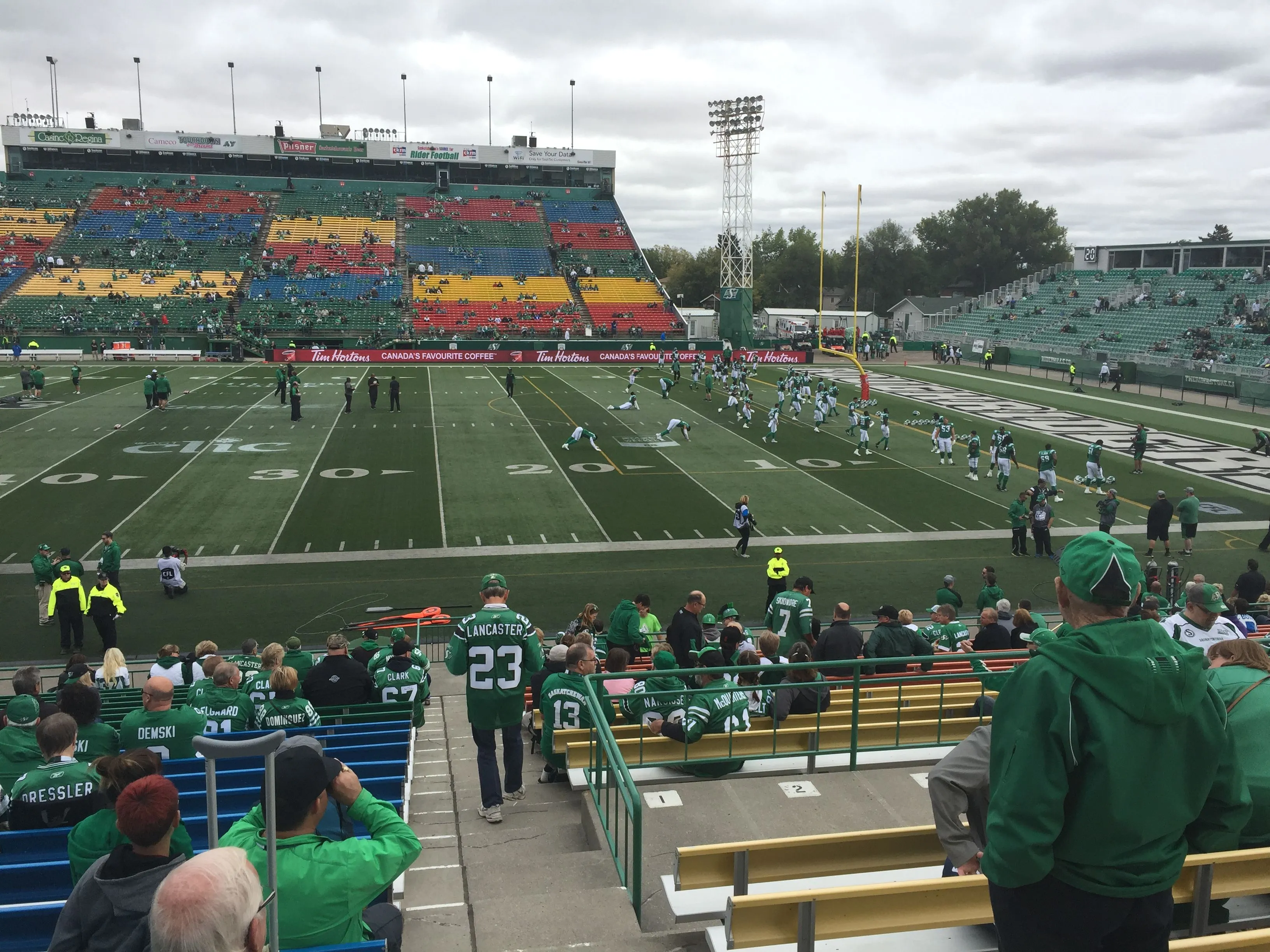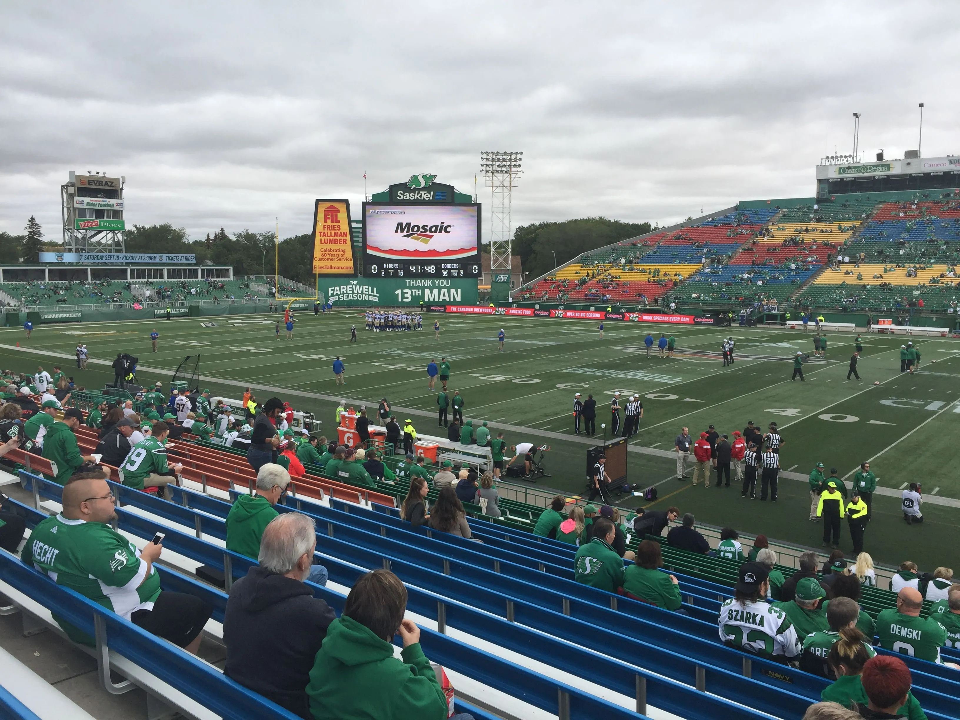 Hopefully there will be more audience when the game starts, or else the "13th man" won't be of help.Watching the ore-game warm up before the football game between the Saskatchewan Roughriders and the Winnipeg Bluebombers.