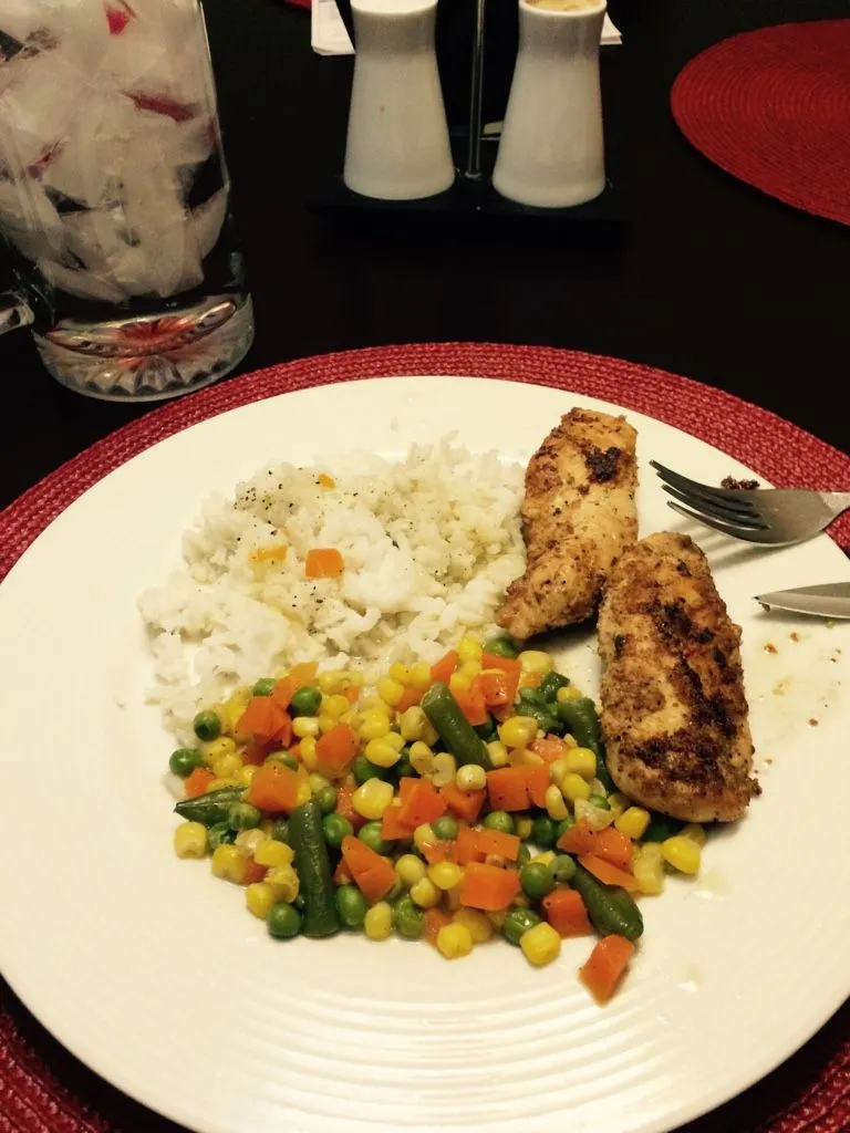 Chicken Strips simmered in butter, rice, mixed vegetables and a tall glass of water [emoji16]