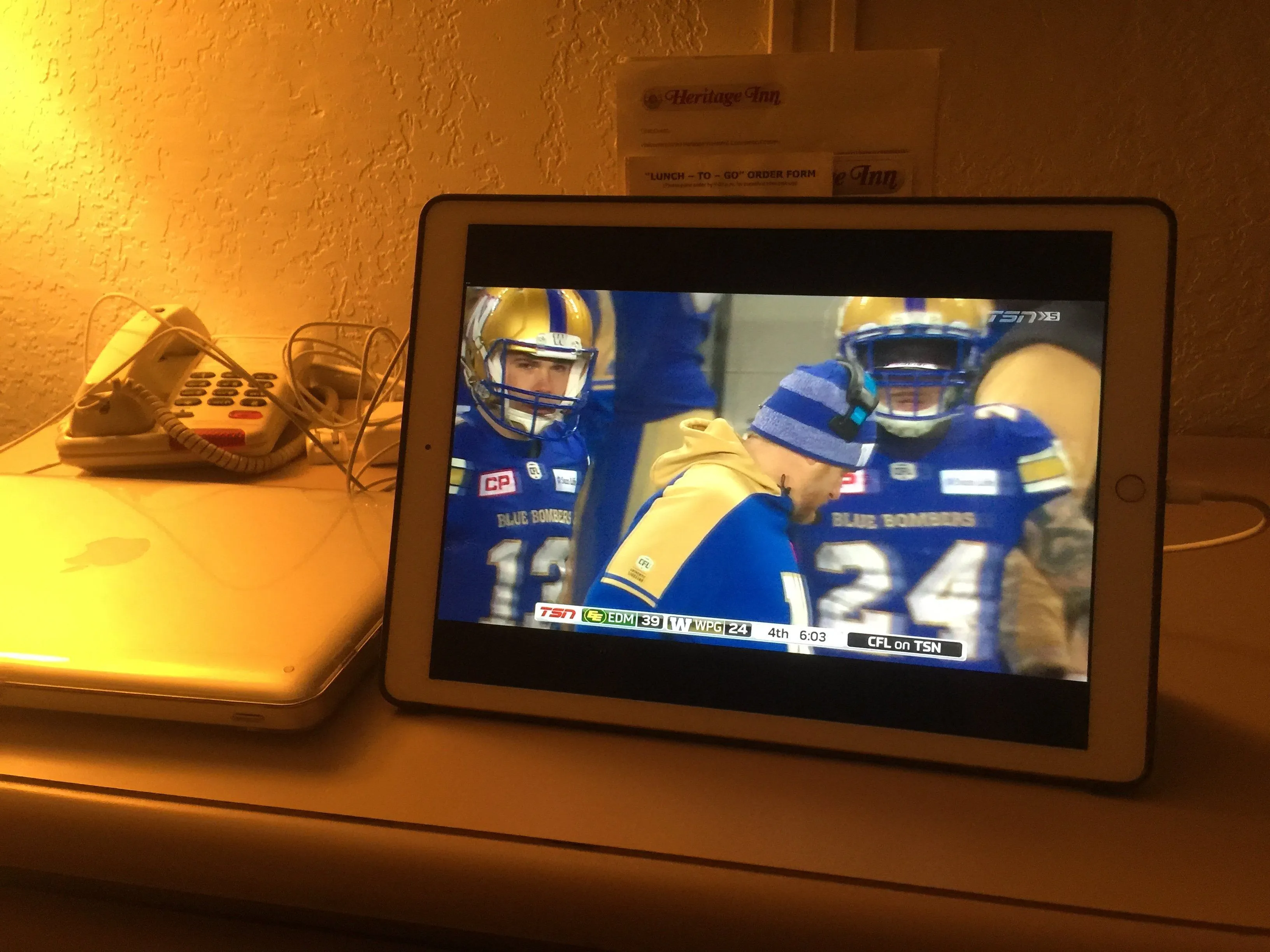 The Saskatchewan Roughriders beat the Ottawa Redblacks 31-20 and the Edmonton Eskimos beat the Winnipeg Bluebombers 39-32. The division finals are next Sunday and the Grey Cup championship game is in two weeks.Watching the CFL playoffs in my hotel room.